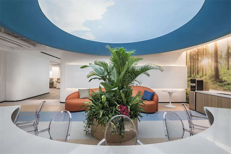 前廳頂部,鏡面質(zhì)感與光帶反射,使空間得到延伸、重疊呼應(yīng),營造出多維的視覺效果,同時打破科技辦公室設(shè)計的刻板印象,擁有寬敞開放的前臺設(shè)計、待客區(qū),層次、質(zhì)感、豐滿而厚重。