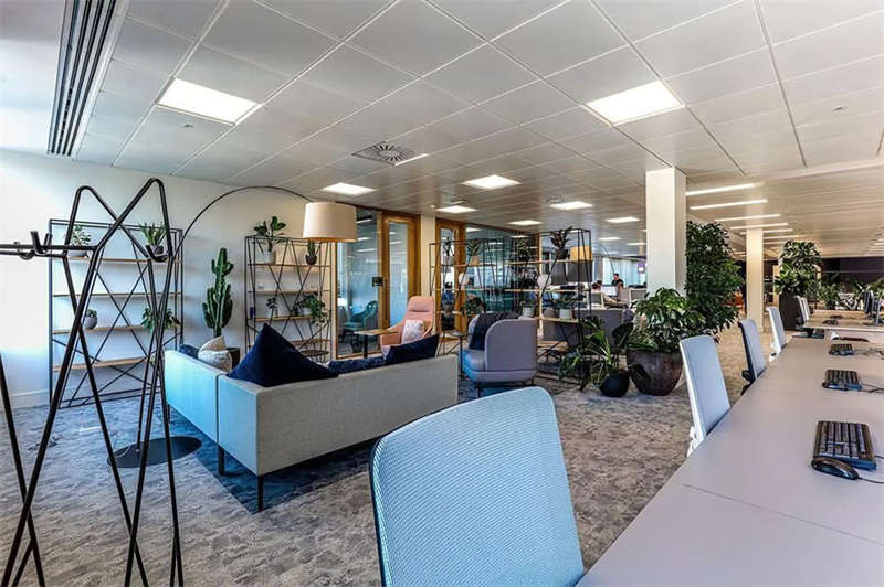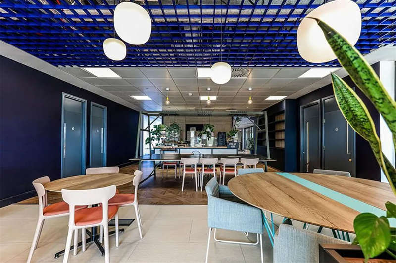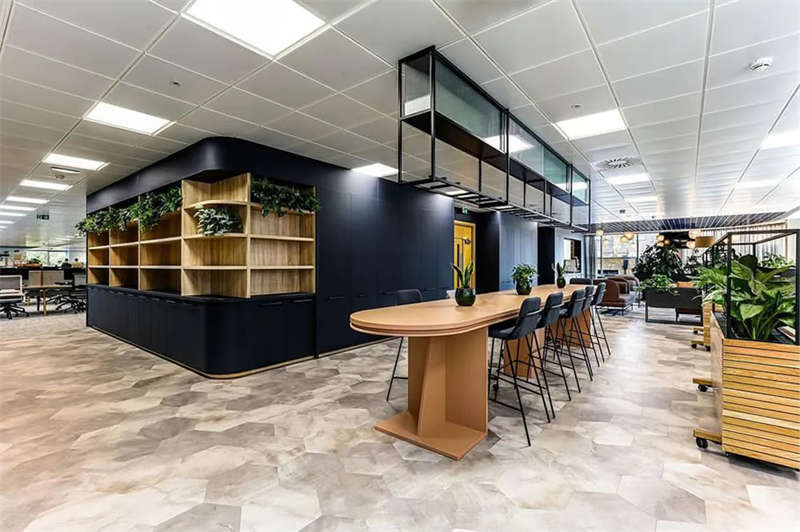 此番改造的一個(gè)重要主因是給到員工愿意回歸辦公室的理由。這意味著提升整體設(shè)施的實(shí)用性和美觀(guān)性,同時(shí)增加協(xié)作空間并整合遠(yuǎn)程工作人員的需求。因此對(duì)當(dāng)代前沿科技的投資成為關(guān)鍵要素。為了支持混合工作模式,設(shè)計(jì)公司在早期就任命了一名AV專(zhuān)家,以便可以通過(guò)應(yīng)用程序或基于桌面的預(yù)訂系統(tǒng)預(yù)訂工作空間。同時(shí),傳統(tǒng)工作站與可替代工作設(shè)施之間的界限也進(jìn)一步擴(kuò)大,平均(NIA室內(nèi)凈面積)比率為1:10。此外,之前辦公桌與員工1:1的比例也被新的1:1.6比例所取代。