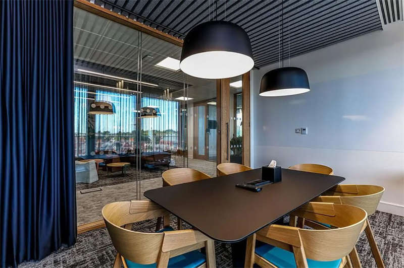 照明方案采用了多種光照的組合形式,以創(chuàng)建自然日光的感覺(jué)。對(duì)于技術(shù)部門(mén)來(lái)說(shuō),重要的是照明不能太高科技感或像一個(gè)大燈箱,因此這里使用了軌道照明代替漫射器和聚光燈。會(huì)議室以吊燈為主,突出與會(huì)人員的面部照明,以及屏幕上方用于遠(yuǎn)程通話(huà)的燈光,因此,需要更專(zhuān)業(yè)的照明設(shè)計(jì),以清晰、明亮的映襯和傳遞人物形象。