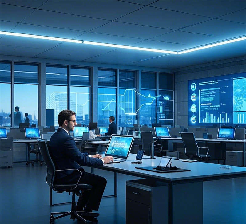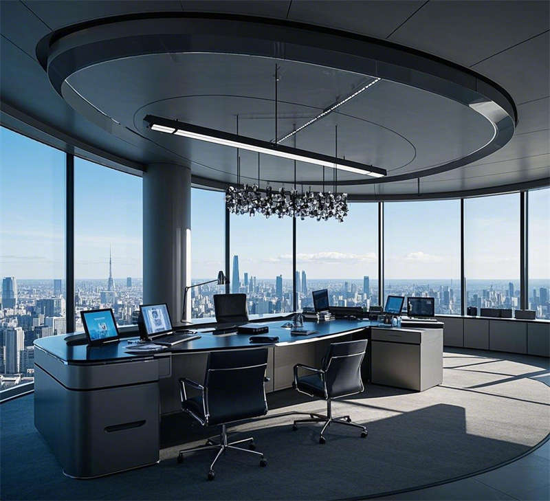 前臺(tái)接待室以懸浮式前臺(tái)和全息投影動(dòng)態(tài)logo為核心,金屬質(zhì)感墻面與燈光效果結(jié)合,營造出未來之門的第一印象。敞開式辦公室通過數(shù)據(jù)流全息屏幕和智能辦公桌,打造高效協(xié)作的數(shù)字化辦公環(huán)境。經(jīng)理辦公室采用全景落地窗和智能辦公系統(tǒng),簡約大氣,兼顧商務(wù)與舒適。總裁辦公室位于頂層,全景視野與奢華材質(zhì)相得益彰,藝術(shù)裝置彰顯領(lǐng)導(dǎo)風(fēng)范。