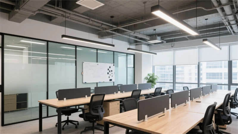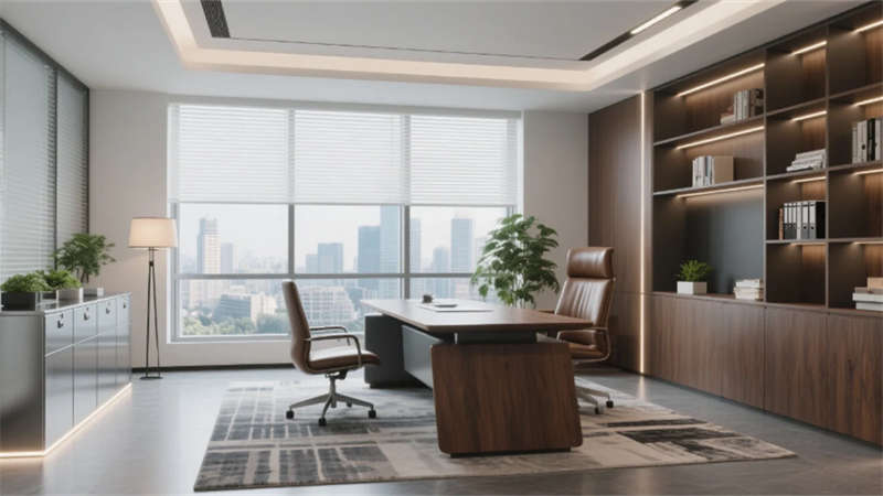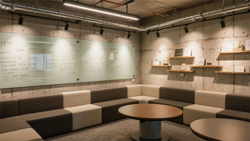 從前臺(tái)懸浮木紋臺(tái)面的企業(yè)標(biāo)識(shí),到開(kāi)放式工位可變的模塊化組合,空間始終保持著“未完成”的進(jìn)化基因。頭腦風(fēng)暴區(qū)的可書(shū)寫(xiě)玻璃墻記錄著思維軌跡,階梯培訓(xùn)區(qū)的滑軌電源系統(tǒng)隨需求生長(zhǎng),智能會(huì)議室霧化玻璃在透明與私密間自由切換,專(zhuān)注電話(huà)艙的磨砂質(zhì)感包裹著獨(dú)立思考的靜謐。高管辦公室的皮質(zhì)座椅與垂直線(xiàn)條燈帶,隱喻著決策的柔韌與果決,而咖啡區(qū)黑板墻的手繪痕跡,則讓機(jī)械齒輪般的空間有了呼吸的節(jié)奏。