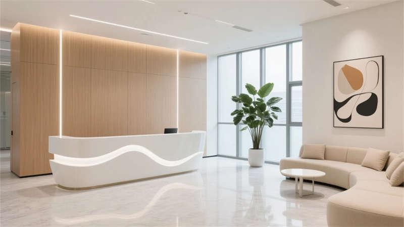 本設(shè)計(jì)以現(xiàn)代簡約為核心理念,通過光與自然的交融重塑辦公體驗(yàn)。空間以純凈的白色與溫潤木色為主調(diào),輔以低飽和度灰綠點(diǎn)綴,營造通透靜謐的氛圍。落地窗最大化引入自然光線,與線性燈帶共同勾勒出流暢的視覺韻律;綠植貫穿每個(gè)角落,從大堂的琴葉榕到辦公區(qū)的垂直花園,賦予空間呼吸感。