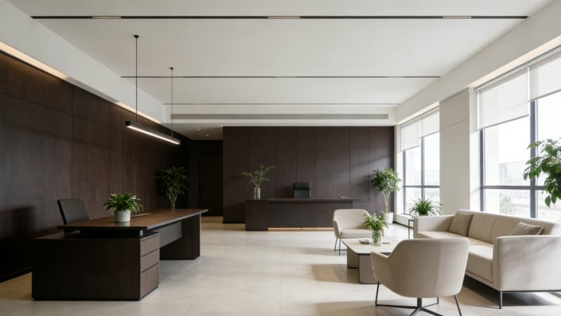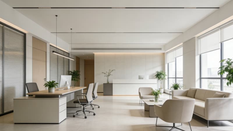 本項目為4000㎡現(xiàn)代簡約風(fēng)格辦公空間,整體以簡潔線條、低飽和度色調(diào)與通透布局打造高效、舒適、大氣的辦公環(huán)境。大樓外觀簡約大氣,凸顯企業(yè)形象;大堂開闊明亮,質(zhì)感材質(zhì)與簡約造型相得益彰;待客廳雅致靜謐,兼顧接待功能與商務(wù)格調(diào);電梯間整潔統(tǒng)一,提升通行體驗。開放式辦公區(qū)分區(qū)合理,采光充足,兼顧協(xié)作與私密性,滿足不同團(tuán)隊辦公需求;經(jīng)理辦公室與總裁辦公室沉穩(wěn)大氣,功能齊全,在簡約中彰顯品質(zhì)與格局。項目從外觀到室內(nèi)空間一脈相承,統(tǒng)一現(xiàn)代簡約設(shè)計語言,注重實用性、舒適性與美學(xué)感,打造集辦公、接待、洽談于一體的現(xiàn)代化商務(wù)空間,助力企業(yè)提升形象與辦公效率。