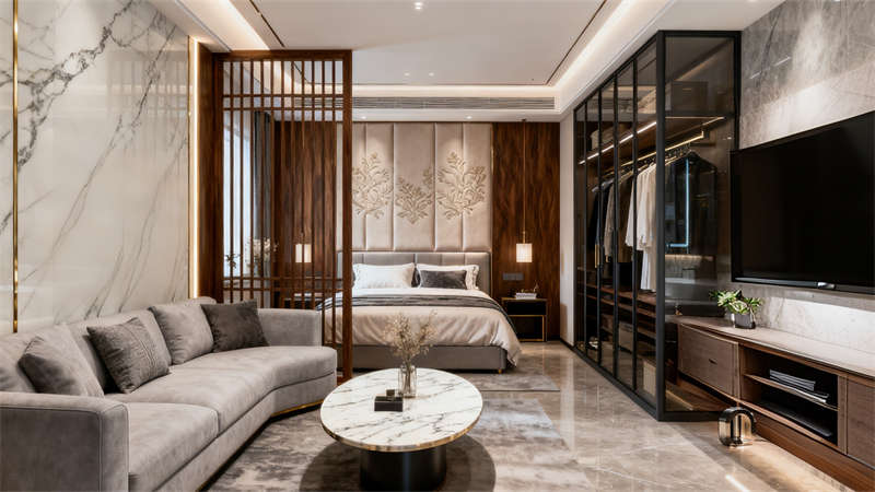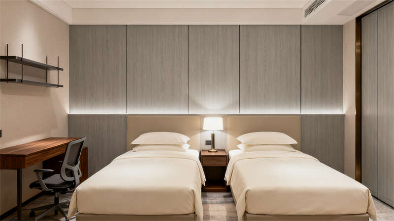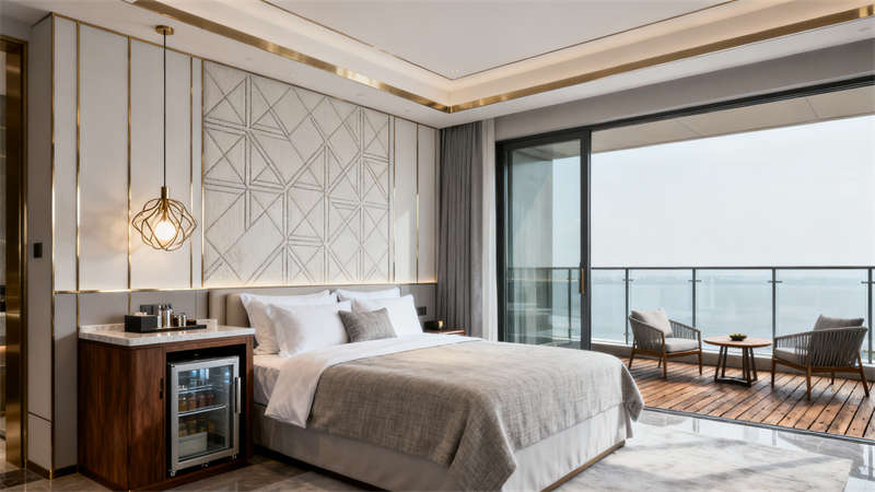 本設計以現(xiàn)代輕奢為核心風格,為蚌埠這家酒店打造出兼具質(zhì)感與溫度的居住體驗。整體空間以低飽和的米灰色系為基底,搭配胡桃木的溫潤與金屬線條的精致,構建出統(tǒng)一且富有層次的視覺效果。?