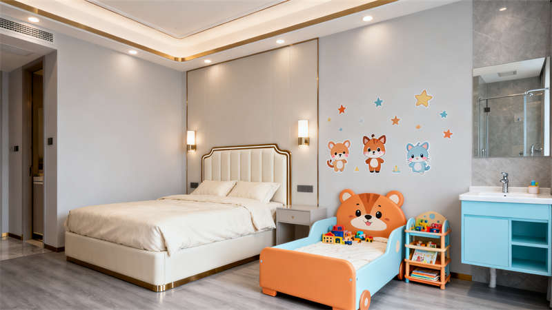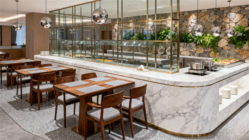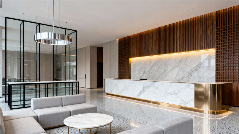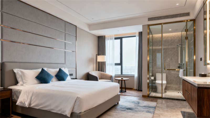 公共區(qū)域與客房保持風格一致,從外觀的玻璃幕墻與石材拼接,到室內(nèi)大堂的胡桃木格柵背景墻、餐廳的金屬框架與大理石臺面,每一處細節(jié)都延續(xù)了現(xiàn)代輕奢的設計語言。軟裝選擇上,莫蘭迪色系的抱枕、暖橘色的點綴,以及自然綠植的融入,為空間增添了溫馨感,讓整體裝修既顯精致格調(diào),又避免了冰冷生硬,全方位提升了酒店的居住與體驗質(zhì)感。?