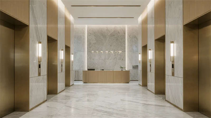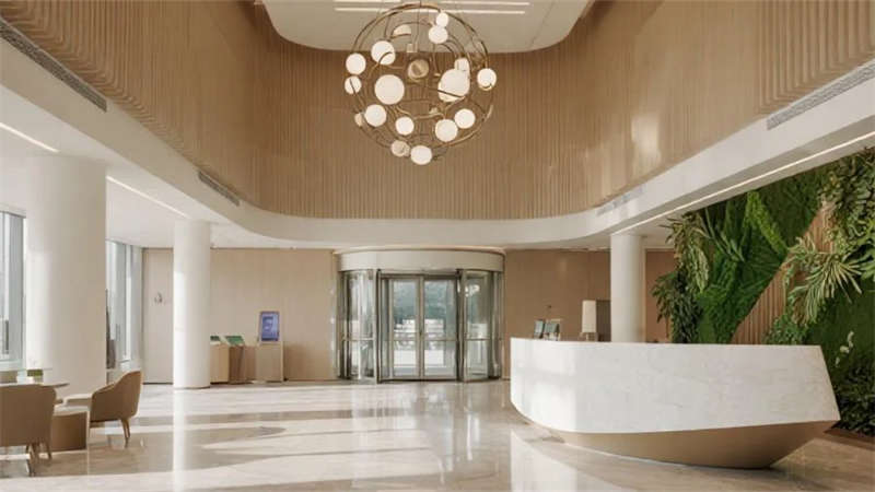 本設(shè)計以現(xiàn)代簡約美學(xué)重構(gòu)辦公空間本質(zhì),建筑外觀采用純凈的玻璃幕墻與幾何切割形體,在晝夜交替中演繹光與影的韻律。入口大廳通過挑高空間與弧形前臺營造開放包容的儀式感,綠植墻與球形燈具的點綴賦予空間自然生機。電梯間延續(xù)極簡語言,香檳金金屬與巖板材質(zhì)碰撞出低調(diào)質(zhì)感。