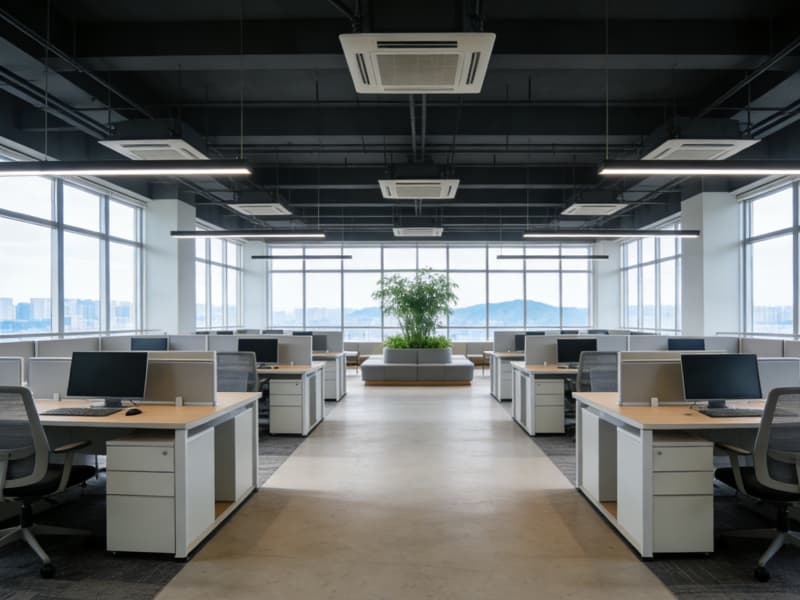 一樓大廳以“開闊通透”為基調(diào),挑高設計搭配質(zhì)感石材地面與藝術裝置,融入徽派建筑的留白意境,入口處的智能導覽系統(tǒng)提升訪客體驗。公共辦公區(qū)采用開放式布局,靈活工位與協(xié)作空間錯落分布,搭配綠植隔斷與自然采光,構建舒適高效的協(xié)作氛圍,三張不同功能的辦公區(qū)效果圖分別呈現(xiàn)獨立辦公、團隊協(xié)作與休閑洽談場景。
