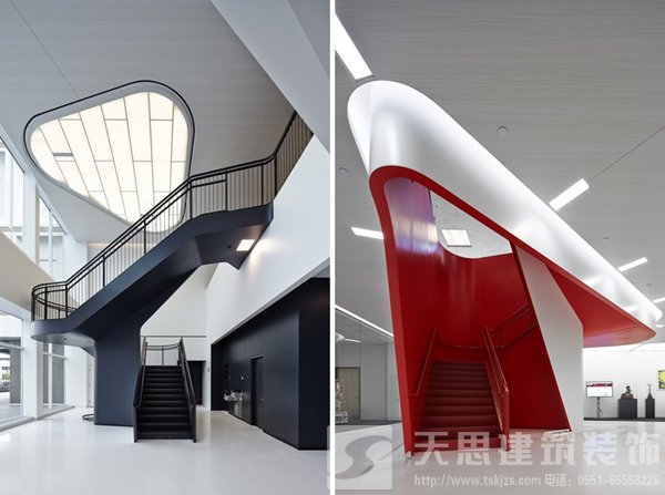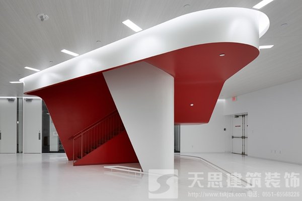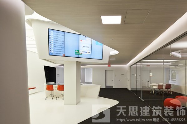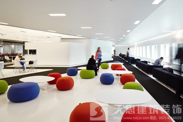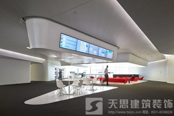 綜合大樓過渡區(qū)設(shè)計為開放式合作工作區(qū)域,傳統(tǒng)的理念通常認為這里和工作場所相比不是那么有用,但是很多富有成效的非正式的討論往往在這里誕生。每個工作中心都配有色彩鮮明的家具,頂部下方挑檐底面突出的吊頂造型內(nèi)嵌LED顯示屏,不斷滾動播出最新信息,包括各種通知、員工和訪客新聞、各種公告、新聞事件以及全球3M公司員工信息。