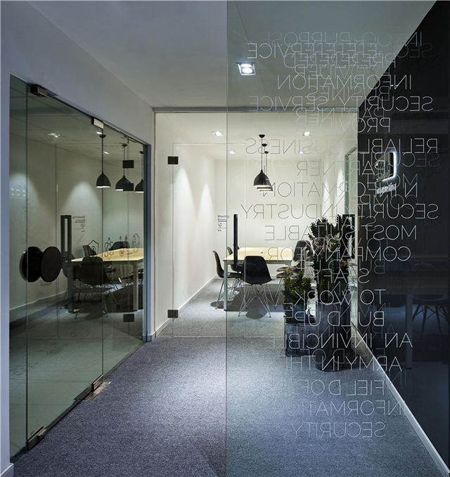 業(yè)主希望突出公司的科技感,主要就以黑白為主,玻璃上的裝飾采用正反拼貼,營造出慢慢消印的代碼的科技感。為了節(jié)省造價(jià),空間使用常規(guī)建材乳膠漆、地毯、地平漆。