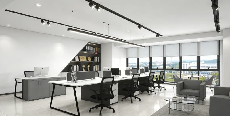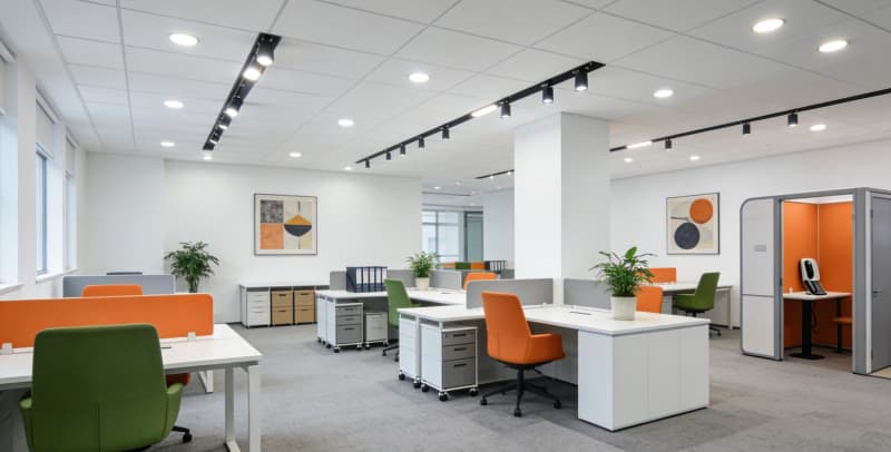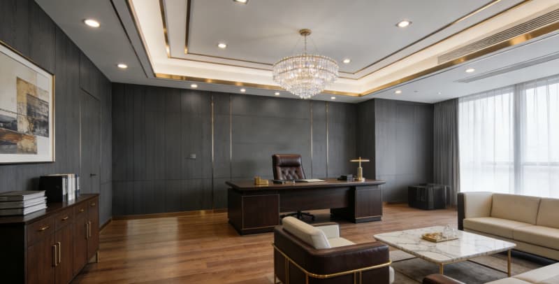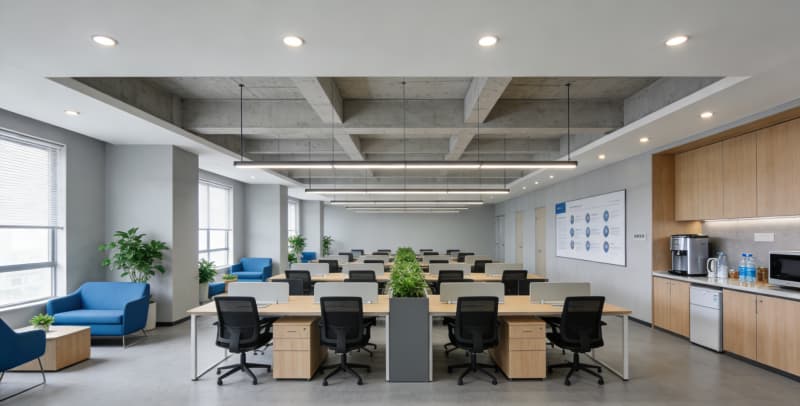 本廠房設(shè)計(jì)以“實(shí)用與美學(xué)共生,工業(yè)與現(xiàn)代交融”為核心,針對(duì)亳州企業(yè)生產(chǎn)與辦公需求,打造4500㎡多功能復(fù)合型空間。外觀采用深灰氟碳噴涂鋁板搭配Low-E玻璃幕墻,以橙色線條點(diǎn)綴,12米通高玻璃入口與金屬發(fā)光LOGO彰顯大氣,太陽能光伏板融入屋頂設(shè)計(jì),兼顧質(zhì)感與環(huán)保。生產(chǎn)區(qū)域按需分區(qū),車間1以金剛砂地坪與裸頂設(shè)計(jì)適配重型生產(chǎn),車間2采用潔凈彩鋼板與環(huán)氧樹脂地坪,滿足無塵標(biāo)準(zhǔn)。辦公區(qū)多元適配,涵蓋簡(jiǎn)約行列式、靈動(dòng)島型及極簡(jiǎn)獨(dú)立工位,搭配PVC地板、地毯等材質(zhì),以淺灰、原木色為基,點(diǎn)綴鮮活色彩。會(huì)議室與總裁辦公室則通過木飾面板、實(shí)木地板等材質(zhì),分別營(yíng)造專業(yè)與輕奢氛圍。整體設(shè)計(jì)平衡工業(yè)質(zhì)感與現(xiàn)代舒適,明確功能分區(qū),適配企業(yè)高效生產(chǎn)與辦公需求。