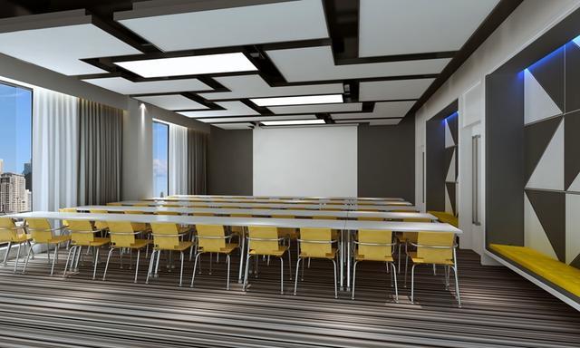 干凈硬朗的員工培訓(xùn)室設(shè)計,符合這個功能區(qū)緊張而又嚴(yán)肅的工作氛圍。右側(cè)設(shè)置有休閑區(qū),搭配幾何造型的立面設(shè)計,可以達到調(diào)節(jié)工作節(jié)奏的效果。