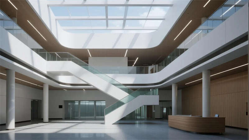 空間內(nèi)核強(qiáng)調(diào)人性化體驗(yàn):挑高中庭以懸浮樓梯創(chuàng)造輕盈動(dòng)線,屋頂花園成為員工觸摸自然的窗口;無(wú)柱車間與智能實(shí)驗(yàn)室展現(xiàn)工業(yè)精密感,而木格柵連廊與綠植墻則注入人文溫度。夜幕降臨時(shí),建筑化為光影容器,冷白光帶勾勒結(jié)構(gòu)輪廓,暖黃窗格透出工作場(chǎng)景的活力。
