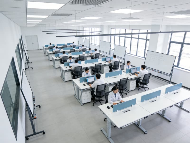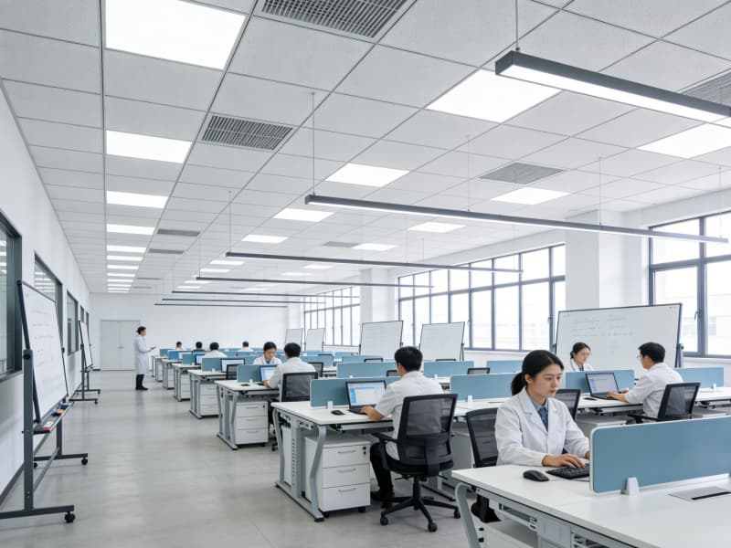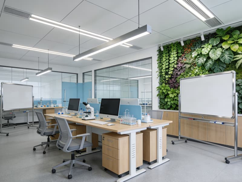 研發(fā)區(qū)營造舒適且富有創(chuàng)意的氛圍。開放式的辦公區(qū)域配備智能升降辦公桌與可移動白板,方便團隊交流與頭腦風暴。實驗室采用模塊化設計,實驗臺布局合理,各類先進儀器有序擺放。通風系統(tǒng)保證實驗環(huán)境安全,同時設置綠植墻,為科研人員舒緩壓力。