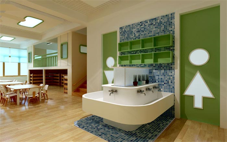 洗手區(qū)域的設(shè)計(jì):此處通往的是就餐區(qū),在洗手池的設(shè)計(jì)上,設(shè)計(jì)師對地面、洗手池都做了處理,目的就是為了避免因?yàn)樗斐傻牡孛鏉窕?,兩個(gè)門一個(gè)進(jìn)一個(gè)出,設(shè)計(jì)是希望可以從小培養(yǎng)孩子排隊(duì)的意識,一進(jìn)一出之間也見證了教育的重要性。