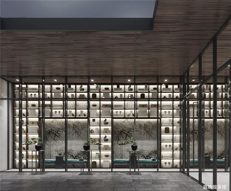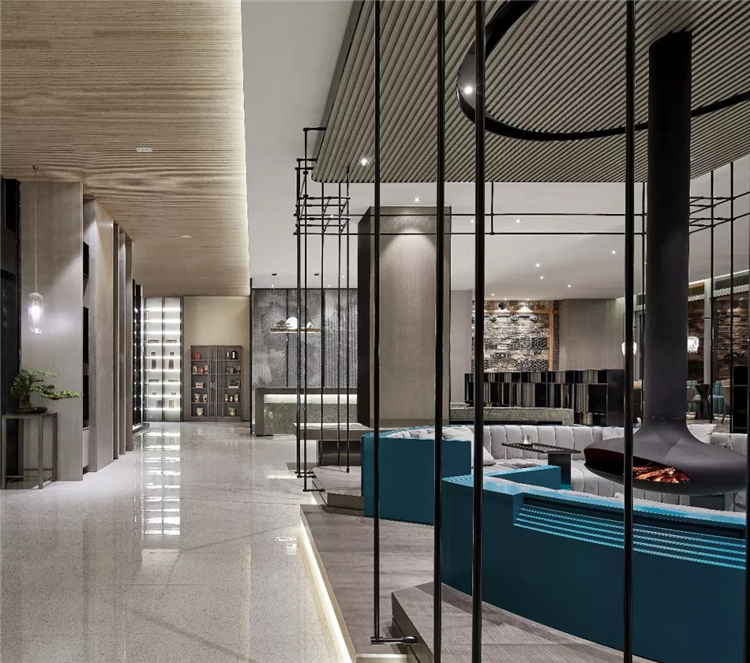 傳統(tǒng)與現(xiàn)代的融合變通,通過汲取傳統(tǒng)徽派的木構(gòu)斗拱、瓦片、留白的山墻和民居的水墨意境,運(yùn)用新的材料進(jìn)行演繹,如水磨石的地面、背景墻藝術(shù)圖案結(jié)合金屬網(wǎng)、半透的夾絲玻璃、黑色的金屬構(gòu)建.以寫意的方式提取徽州的意境,延續(xù)徽派建筑的黑白兩色,再點(diǎn)以中國傳統(tǒng)色系軟裝搭配,表達(dá)了設(shè)計對傳統(tǒng)的回歸和未來的展望.