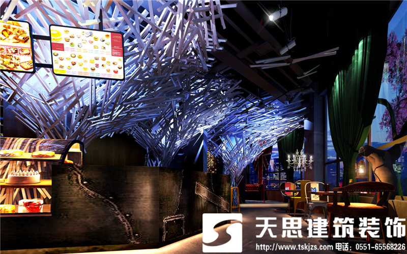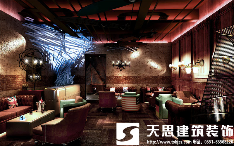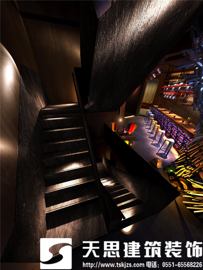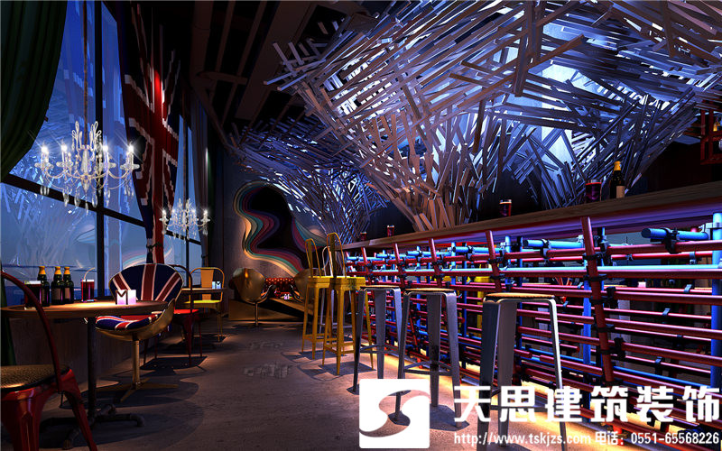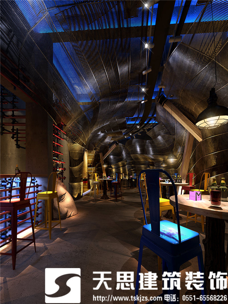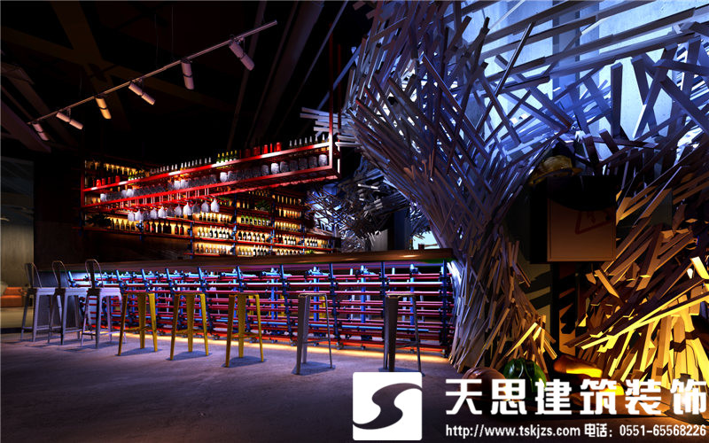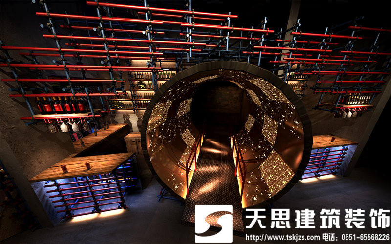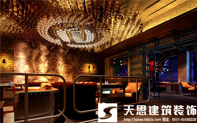 一層吧臺處,方鋼構(gòu)建的造型樹自由,飄逸,充滿藝術(shù)張力。鋁制吧臺搭配特制的建筑腳手架座椅,工業(yè)范兒十足,還原了建筑的純粹美感。鋼板樓梯處用射燈做呼應(yīng),浪漫且工業(yè)氣息濃郁。通道處,玫瑰金鋼板勾勒的點點星光自由浪漫,展現(xiàn)了工業(yè)元素的獨(dú)有魅力。包間,原有紅磚墻處理后的墻面中性硬朗,鐵網(wǎng)做成的遮擋裝飾飄逸自由,營造的私密效果恰到好處。玻璃上的手繪勾勒出包間裝飾畫,讓視角多了一絲抽象派的趣味。
