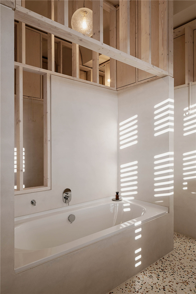 灰白色的墻壁與蘑菇色的地板搭配,還有沙黃色的窗簾和床罩。床架、擱架和床頭柜都是由淺色膠合板制作而成,這種膠合板在制造過程中分泌出天然樹脂,使其外觀略顯陳舊,水磨石瓷磚用于整個浴室。