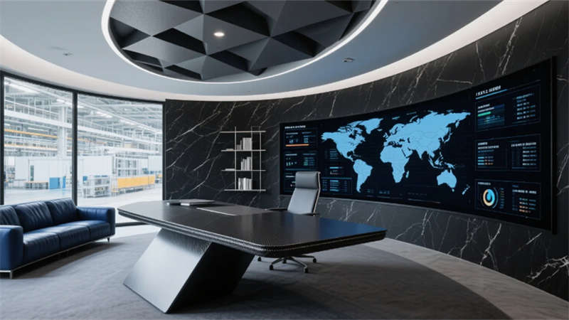 開放式辦公區(qū)打破傳統(tǒng)壁壘,蜂窩狀工位與懸浮綠植裝置詮釋靈動協(xié)作,透明屏幕上的數(shù)據(jù)流與玻璃隔斷投影的生產(chǎn)流程圖虛實相映??偛每臻g則如懸浮的智慧中樞,弧形落地窗將車間全景化作動態(tài)壁畫,金屬與大理石的碰撞間,流淌著決策與創(chuàng)新的電流。智能倉儲區(qū)立體貨架的金屬骨骼間,無人機如蜂鳥般掠過貨品,天光與電子標簽的光斑在環(huán)氧地面上跳動著數(shù)字時代的韻律。
