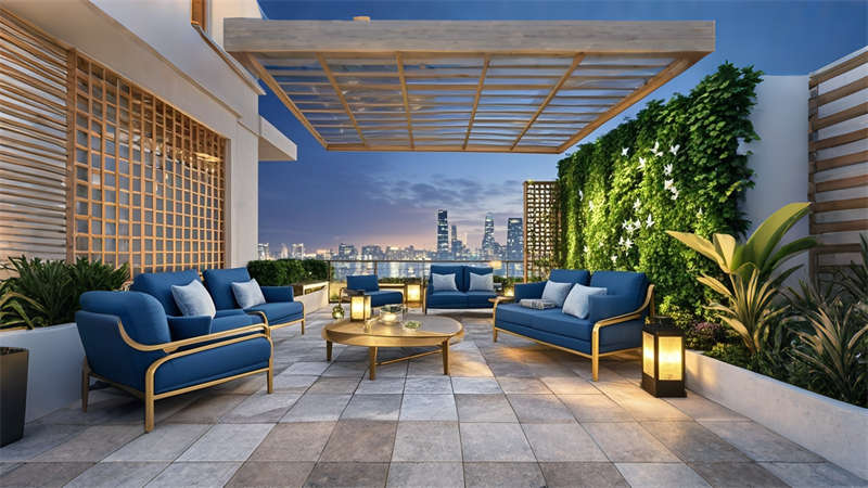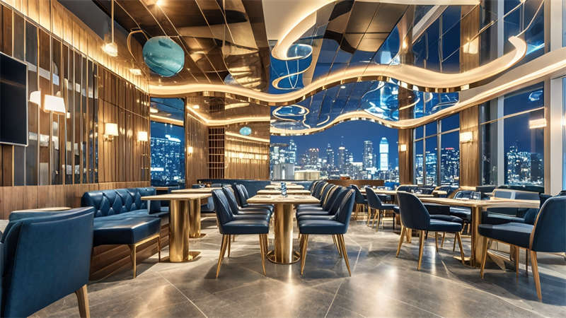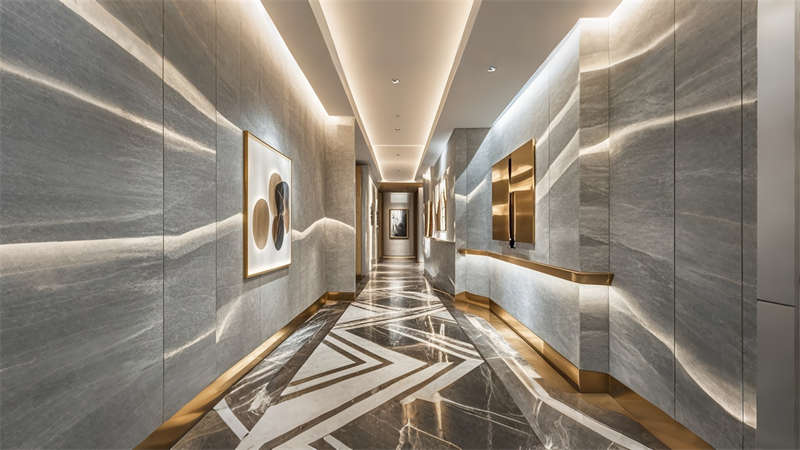 色彩體系以香檳金與深海藍(lán)為主調(diào),大堂采用香檳金金屬線條勾勒建筑肌理,搭配深海藍(lán)大理石營(yíng)造視覺重心??头繀^(qū)運(yùn)用暖灰硬包墻面平衡色彩強(qiáng)度,通過(guò)2700K暖光與4000K中性光分區(qū)照明塑造晝夜場(chǎng)景。材質(zhì)組合注重層次:大理石地面、金屬構(gòu)件、絨布軟包形成質(zhì)感三部曲。