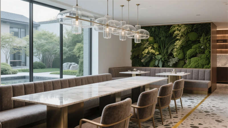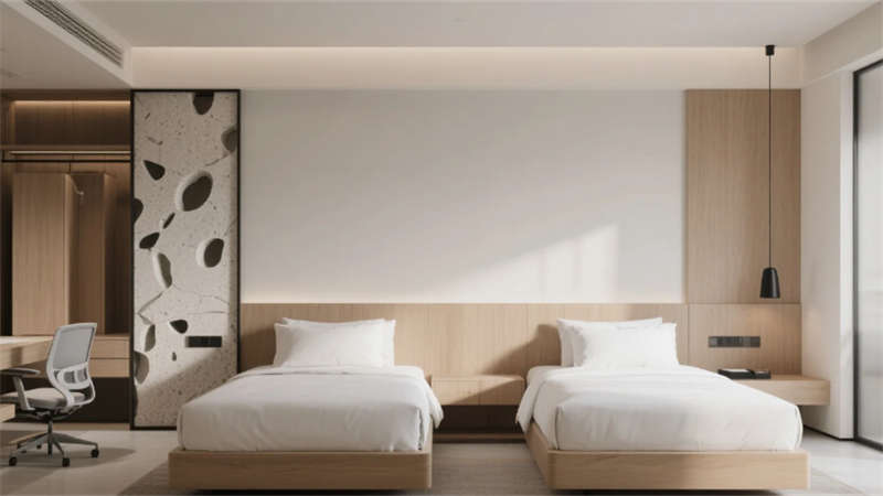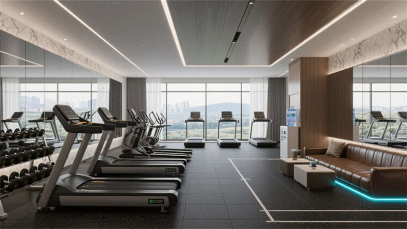 客房以中性色調(diào)為基底,亞麻、柚木與肌理墻面營造松弛感,智能化系統(tǒng)隱于無形,從電動紗簾到無線充電桌,細節(jié)中滲透科技溫度。雙床房的可移動屏風(fēng)與定制家具,兼顧私密與靈活;衛(wèi)浴空間以霧面玻璃與水磨石打造朦朧質(zhì)感,啞光五金件點綴現(xiàn)代精致。餐廳以共享長桌與綠植墻激活社交氛圍,水磨石地面鑲嵌的黃銅線條如溪流蜿蜒,呼應(yīng)徽派建筑中的流水意象。健身房鏡面與橡膠地面反射城市燈火,休憩區(qū)的皮質(zhì)軟榻與漸變燈光,為運動后提供片刻寧靜。