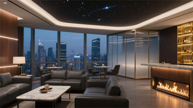 最驚艷的屋頂花園酒吧,木格柵切割都市夜空,發(fā)光吧臺(tái)與夜光植物墻在霧化玻璃間若隱若現(xiàn),火光與星空投影為每杯特調(diào)注入故事感。這座酒店不止是棲居之所,更是一場(chǎng)穿越材質(zhì)、光影與城市天際線(xiàn)的沉浸藝術(shù)展。