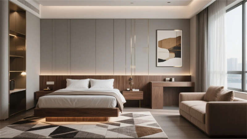 以低飽和度中性色調(diào)為基底,這座酒店將現(xiàn)代輕奢美學(xué)與在地文化氣韻悄然相融??臻g以胡桃木的溫潤(rùn)、金屬線(xiàn)條的利落與自然光影的詩(shī)意共筑視覺(jué)語(yǔ)言,藝術(shù)裝置如隱形的敘事者串聯(lián)起流動(dòng)的場(chǎng)域精神。