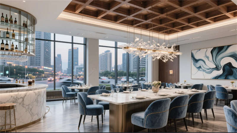 步入挑高大廳,懸浮水晶燈傾瀉柔光,旋轉(zhuǎn)樓梯以雕塑形態(tài)定格動(dòng)態(tài)美學(xué),綠植墻與大理石的對(duì)撞詮釋自然與精致的共生。全日餐廳借落地窗框景四季,絲絨餐椅與光影交織出慵懶的晨昏;行政酒廊夜幕降臨時(shí)化身空中藝?yán)龋强仗旎ㄅc城市燈火共舞,霧化玻璃切換著商務(wù)與私享的邊界。