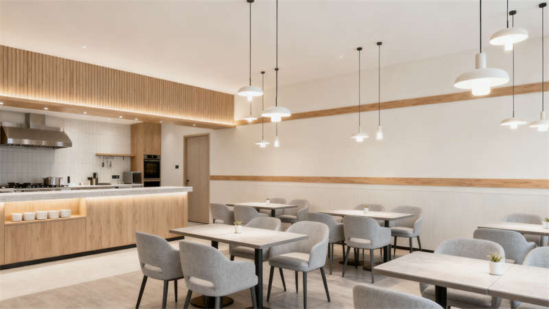 餐廳區(qū)域設計簡潔而富有質感,燈光設計巧妙,既保證了充足的照明,又營造出溫馨的用餐氛圍,桌椅擺放合理,留出足夠的活動空間,讓住客能在舒適的環(huán)境中享受美食。?
