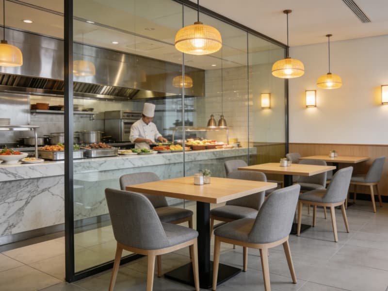酒店一層為公共區(qū)域,大堂地面鋪淺灰色大理石,前臺(tái)背景墻以巖板結(jié)合藝術(shù)裝置,彰顯格調(diào)。大堂吧設(shè)半私密卡座,供客人休憩交流。全日制餐廳配備開放式廚房,可讓客人直觀感受美食制作過程。