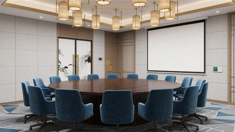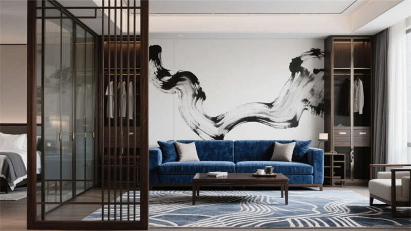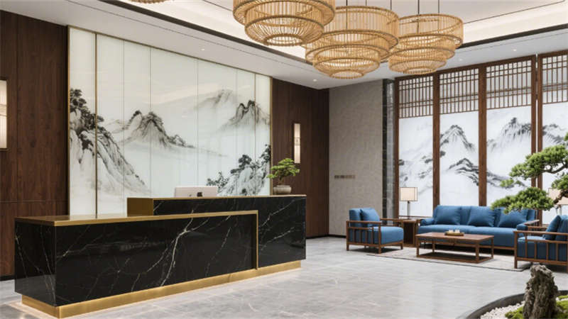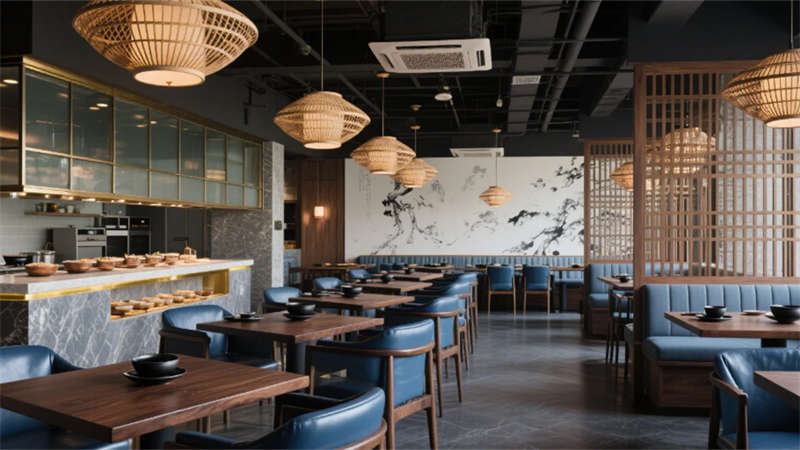 步入大堂,深胡桃木墻面與淺灰石材地面構(gòu)成經(jīng)典東方底色,水墨藝術(shù)玻璃屏風(fēng)似山巒疊嶂,懸浮竹編吊燈以編織肌理軟化空間。靛藍(lán)色沙發(fā)與黃銅細(xì)節(jié)的點(diǎn)綴,既延續(xù)外立面色彩邏輯,又激活視覺層次。餐飲空間延續(xù)木格柵語(yǔ)言,竹編燈罩與黑陶器皿在開放式廚房的金屬框架中碰撞,演繹“新舊共生”的餐飲儀式。