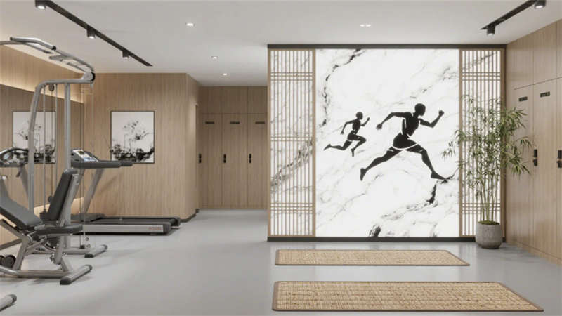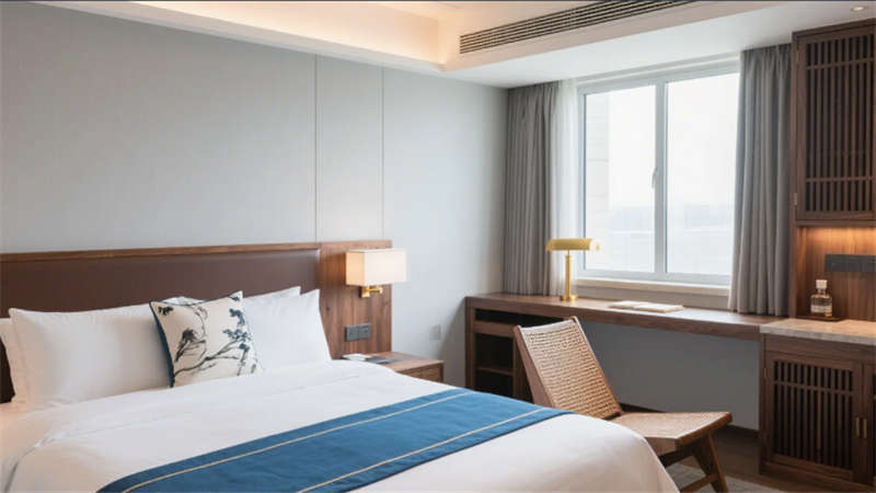 客房區(qū)域以“去符號(hào)化”手法詮釋東方美學(xué):深木紋床頭背板嵌入隱晦的水墨紋樣,藤編躺椅與迷你吧木格柵柜體,在3000K暖光中營(yíng)造居停的松弛感。套房通過(guò)絲絨沙發(fā)與抽象水墨畫提升奢華調(diào)性,浴缸區(qū)的竹藝卷簾巧妙平衡通透與私密。公共空間亦貫徹統(tǒng)一語(yǔ)匯——健身房竹編地墊與水墨運(yùn)動(dòng)壁畫、走廊絹絲燈箱與枯山水景墻,皆以現(xiàn)代材質(zhì)轉(zhuǎn)譯傳統(tǒng)元素。