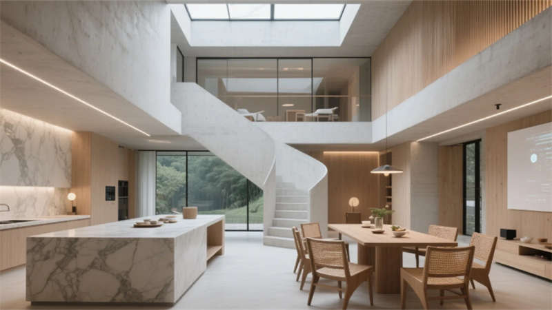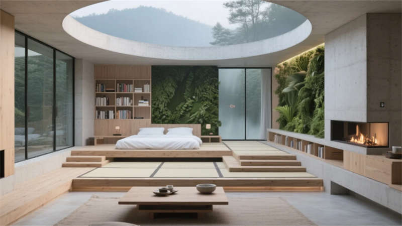 客房以極簡(jiǎn)的智慧回應(yīng)棲居本質(zhì)。榻榻米地臺(tái)消弭床與地面的界限,270°環(huán)景霧化玻璃輕觸即透,仿生綠植在智能光影中呼吸生長(zhǎng),隱藏式投影幕布落下時(shí),星空與林海皆成私享背景。階梯書(shū)吧的垂直綠植墻下,模塊化沙發(fā)隨需求自由組合,全息粒子在空氣中勾勒出流動(dòng)的藝術(shù),而巖板中島餐廳里,藤編座椅與吊燈矩陣的光暈交織,智能調(diào)光天窗讓每一餐都浸染著天光的溫度。