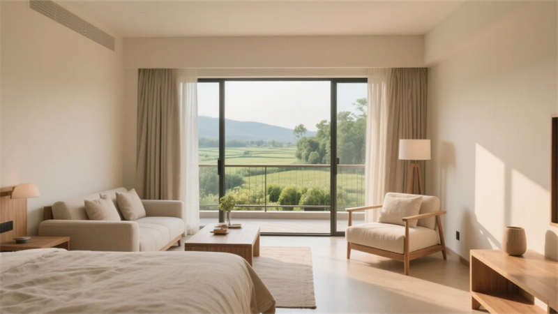 這座鄉(xiāng)村民宿以現(xiàn)代簡約風(fēng)格為核心,將自然與建筑融為一體。設(shè)計(jì)強(qiáng)調(diào)線條的干凈利落和材質(zhì)的原生質(zhì)感,白色墻面與木質(zhì)結(jié)構(gòu)形成對(duì)比,大面積的玻璃引入田野與天空的景致,讓室內(nèi)外界限模糊。庭院保留原生植被,通過碎石與木平臺(tái)的組合,營造出輕松的氛圍。