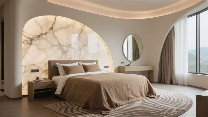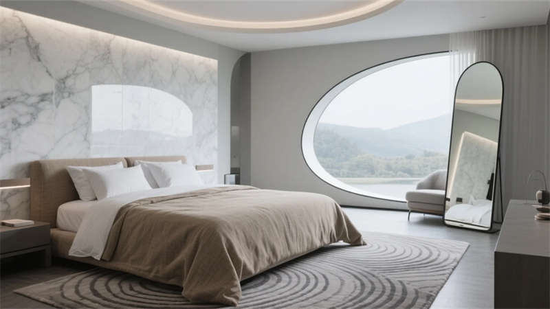 每一處細節(jié)皆成藝術現(xiàn)場——走廊夯土墻鐫刻時光肌理,發(fā)光地磚指引探索路徑;臥室弧形鏡面折射虛實,讓人沉入湖居夢境。這里不僅是棲居之所,更是一場喚醒感官的在地美學巡禮,讓合肥的湖韻林語,成為流淌于日常的奢享印記。