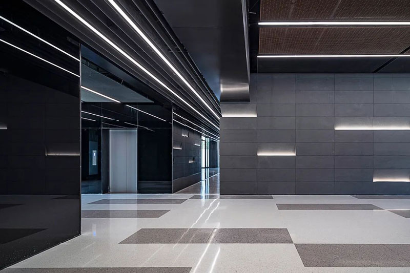 室內空間造型多以棱角分明的幾何形體為主,減少裝飾類細部,鐵銹褐、水泥灰、煙熏黑等暗冷色調元素交織在一起。局部通過紅磚作為點綴,減少淺色系材質的使用,讓自然光線將空間變得更有質感。