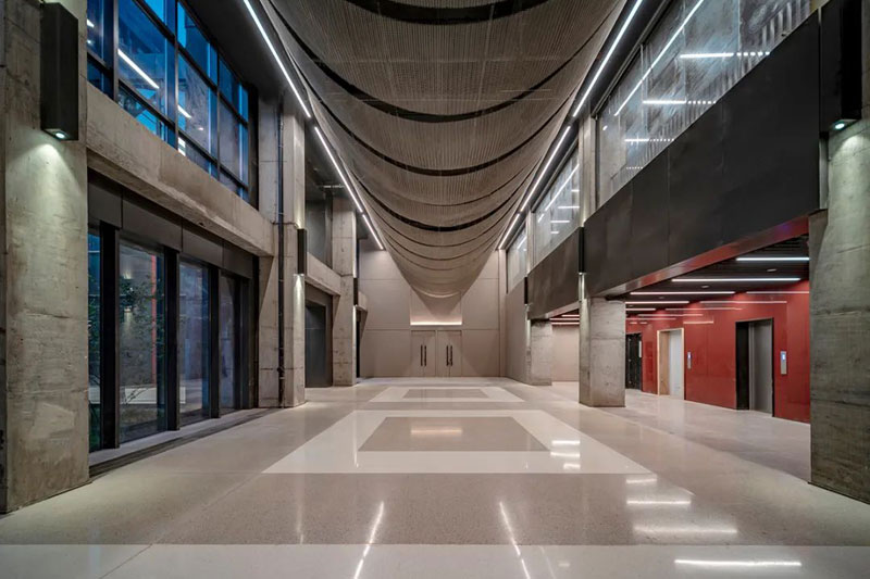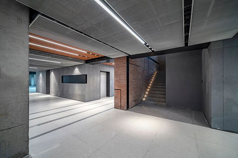 使用材料多以粗獷的質感呈現(xiàn),水泥漆、灰泥、銹鋼板、金屬網(wǎng)、水泥板,還有裸露的混凝土,表現(xiàn)出工業(yè)建筑豪放的質感。奔放、濃重、豁達,形成室內公共空間的性格。