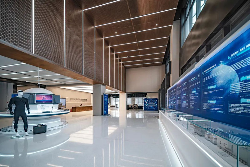 低飽和度紅色鋼板與黑色鋼板形成視覺碰撞,銹板前臺、懸浮燈飾與金屬結構架讓空間闊達簡練,通高的玻璃幕墻借景舊建筑的殘影,使之成為室內裝飾的一部分。