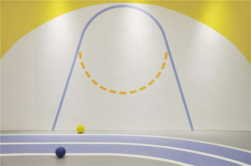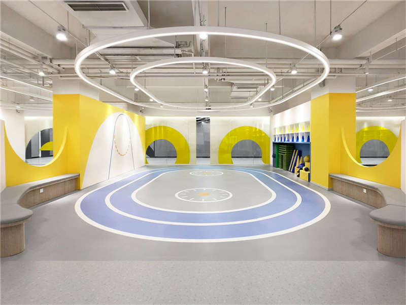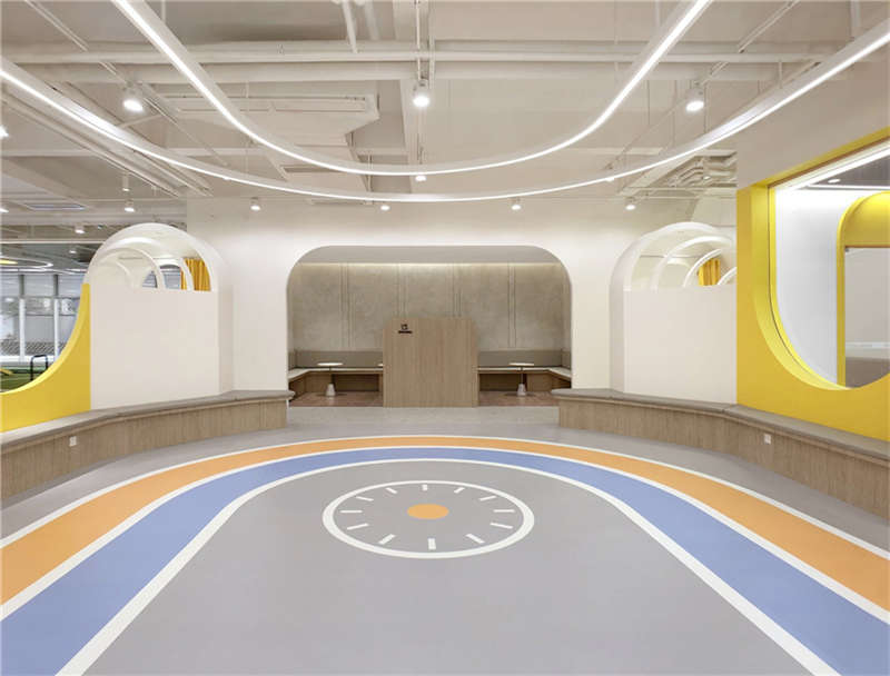 利用樓宇的縱向夾角空間,層層疊出的形象是進(jìn)入星球的能量加速器。地上的黃色跑道是孩子們丈量自己成長(zhǎng)的T臺(tái),每個(gè)小朋友通過(guò)跑道后都擁有更強(qiáng)的生命力。緊鄰接待區(qū)的泡泡池是迎接孩子們的歡樂(lè)地,背后的鏡面構(gòu)筑了游離在現(xiàn)實(shí)與夢(mèng)境之間的界限,折射出孩子更加廣闊的天空,讓能量加倍!