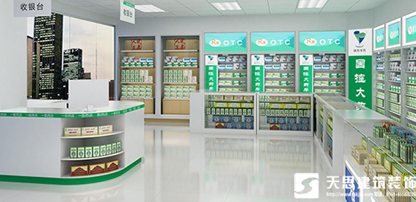 2.店內(nèi)的裝潢設(shè)計(jì)-藥店的裝潢設(shè)計(jì),要滿足視覺(jué)的體驗(yàn)。顏色不宜太亮,也不宜太光明了,一般以簡(jiǎn)潔明了來(lái)滿足大家了;藥店對(duì)店鋪層高的要求一般在3米以上,但由于所選擇的店面多數(shù)處于底層,天花板下多數(shù)有下水管、電線管、消防管等管道,這時(shí)不要安裝吊頂天棚將這些管道隔離,只要這些管道粉刷成純白色,并將光源置于管道之下即可,這樣既可以保證商店的空間,又可以節(jié)省費(fèi)用。