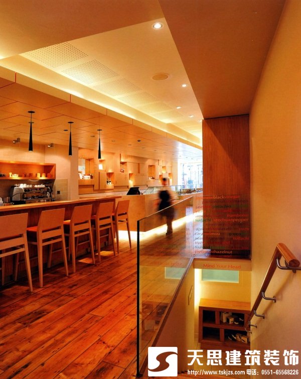 店鋪后部特別定制的玻璃吊燈象征著可可豆的豆莢。其他的設(shè)計(jì)元素包括回收的松木地板、石灰石柜臺(tái)和臺(tái)面、鮮橙色皮革、橡木制品以及長(zhǎng)條噴漆天花板。北京餐廳設(shè)計(jì)師在處理天花板時(shí),將不同的元素統(tǒng)一在一起,突出了空間的長(zhǎng)度并將人們的眼球吸引到店鋪后部。地下室主要是用來(lái)展示的廚房,里面設(shè)置著巧克力制作課程和工坊。