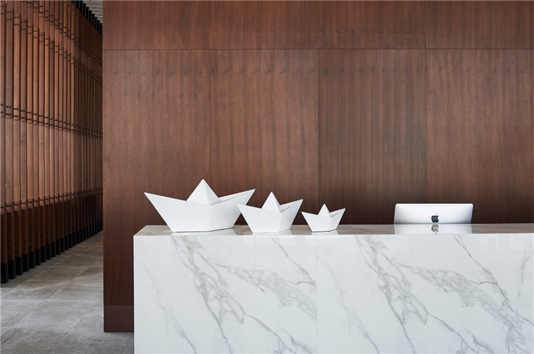 大堂和餐廳的內(nèi)部特色是光滑的白色石膏墻壁、大理石、黃銅和深色的木材家具。這里用了一個(gè)白色,純凈,簡(jiǎn)單的立面,走進(jìn)里面,仍然會(huì)感覺到白色,但同時(shí)我們使用了一些其他的材料。所有的顏色都來自真實(shí)的材料,讓你進(jìn)入室內(nèi)時(shí)更溫暖。