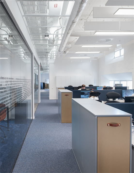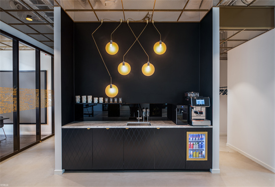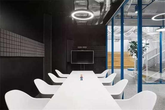 時(shí)尚與藝術(shù)并存的辦公室設(shè)計(jì)案例:整個(gè)空間設(shè)計(jì)手法簡約,原有建筑構(gòu)造和設(shè)備管線都展露無遺,色彩的巧妙構(gòu)筑讓這處極簡loft風(fēng)的辦公環(huán)境充滿了時(shí)尚的活力氛圍。墻面上充滿活力的圖案和一張乒乓球桌是視覺中的主角,而主入口就在這里。這里沒有傳統(tǒng)的接待臺(tái),訪客進(jìn)入辦公室,可以為自己沖杯咖啡,然后進(jìn)入到內(nèi)部空間。入口處設(shè)有員工更衣室。辦公室的中央是一處大型演講廳,也是主要的活動(dòng)場所。多功能演講廳配有看臺(tái)式階梯座、咖啡吧、屏幕和投影儀、講臺(tái)和所有其它必要的設(shè)備,即可以舉辦研討會(huì)、各種宣講,也是一處極為舒適的聚會(huì)場所??臻g內(nèi)的照明設(shè)計(jì)非常獨(dú)特,采用了網(wǎng)格狀的矩陣布局,將所有燈具串聯(lián)在一起,形成精致的美學(xué)效果。整個(gè)空間形成一個(gè)明亮的背景,襯托出有趣的設(shè)計(jì)細(xì)節(jié)和墻面圖形設(shè)計(jì)。