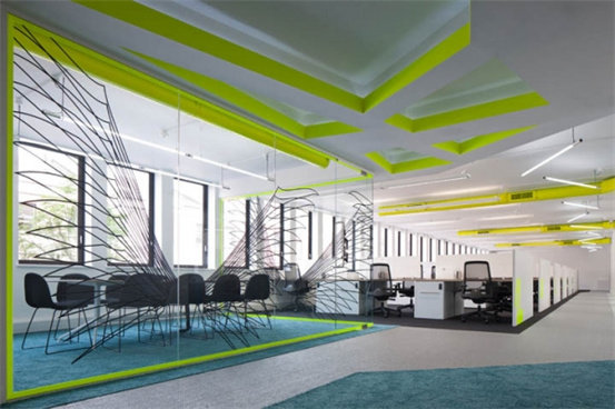 時(shí)尚辦公室裝修設(shè)計(jì):以白色為空間主調(diào),加入充滿活力的顏色,如霓虹黃色頂面線槽、以及柔軟的綠松石色地毯點(diǎn)綴在灰與黑色地毯間。裸露的頂面管道噴涂以同樣的黃色;每一組工位都以醒目的霓虹黃色字母加以標(biāo)識(shí)。空間的其它色彩以中性色加以調(diào)和,以免跳躍的霓虹黃色太過強(qiáng)烈刺激。會(huì)議室的玻璃隔墻,上面繪制了一系列的天使(Angel)翅膀圖形,為密集的辦公區(qū)增添了豐富的視覺效果。休閑區(qū)與辦公區(qū)之間一道纏繞于金屬管道之間的紅色Z字型隔屏,活躍了空間色彩。設(shè)計(jì)師以清新簡約的空間配色,打造了一個(gè)開敞明亮、且獨(dú)具個(gè)性特色的時(shí)尚辦公室。