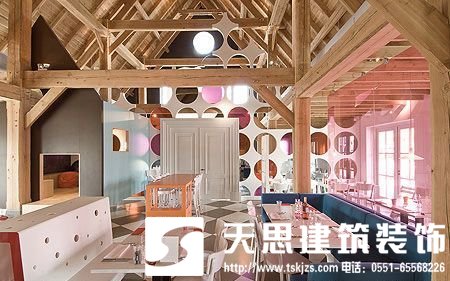 餐廳的建筑特色是一個(gè)由龐大的木梁搭成的農(nóng)場屋頂。在餐廳設(shè)計(jì)空間中,我們試看通過鋪設(shè)家具和一些在物體、家具或空間本身之間形成的交叉元素來創(chuàng)造一個(gè)生動(dòng)有趣的世界。比如,將一張桌子變成一個(gè)窗戶、一輛巴士或者一個(gè)廚房。中央位置六米高的結(jié)構(gòu)看起來像一圈抽象的云霧,五顏六色,同時(shí)又與手工搭成的精美建鋪物形成和諧對比。