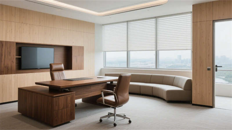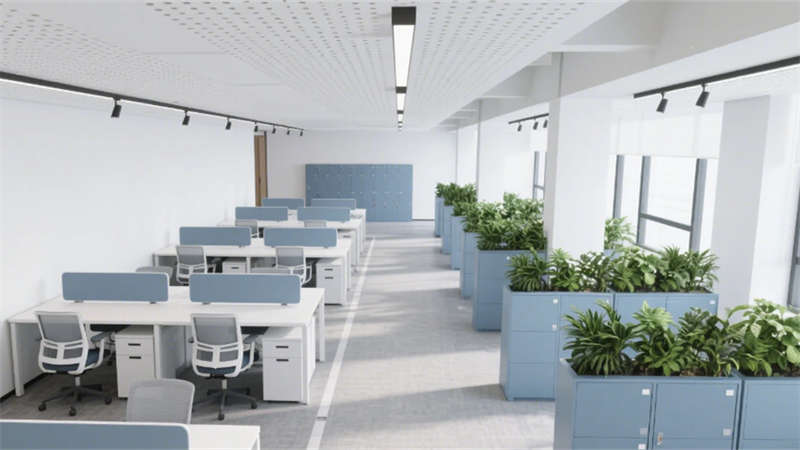 室內空間強調功能與美學的平衡:入口大堂通過12米挑高藝術玻璃墻與企業(yè)色燈光系統(tǒng),構建極具辨識度的第一視覺;開放式辦公區(qū)以模塊化工位、綠植隔斷及通透采光優(yōu)化協(xié)作效率;高管辦公室與會議空間則運用木飾面、吸音材質及智能設備,兼顧私密性與科技感。全案貫穿暖灰主色調,局部以藍、橙跳色激活空間活力,啞光金屬、線性燈光與天然材質碰撞,營造理性而不失溫度的氛圍。