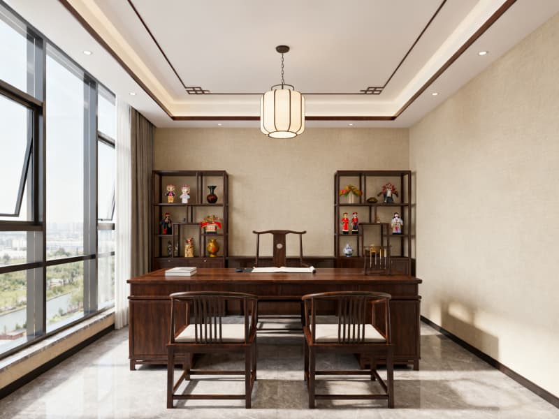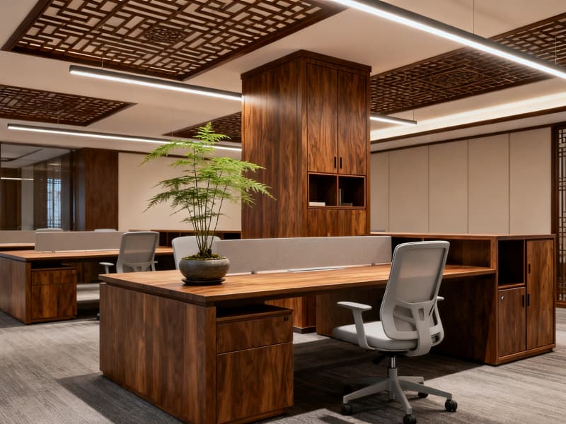 空間布局上,科學(xué)劃分開(kāi)放辦公區(qū)、獨(dú)立辦公室、會(huì)議室、休閑區(qū)等功能區(qū)域,優(yōu)化動(dòng)線(xiàn)設(shè)計(jì),保證辦公效率與使用舒適度。色彩以淺色系為基底,搭配深棕色實(shí)木元素,營(yíng)造雅致、沉穩(wěn)的視覺(jué)效果,同時(shí)通過(guò)落地玻璃窗、中式格柵吊燈等設(shè)計(jì)引入充足自然光線(xiàn),減少空間壓抑感。