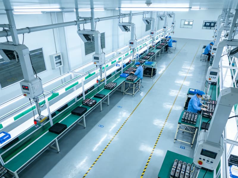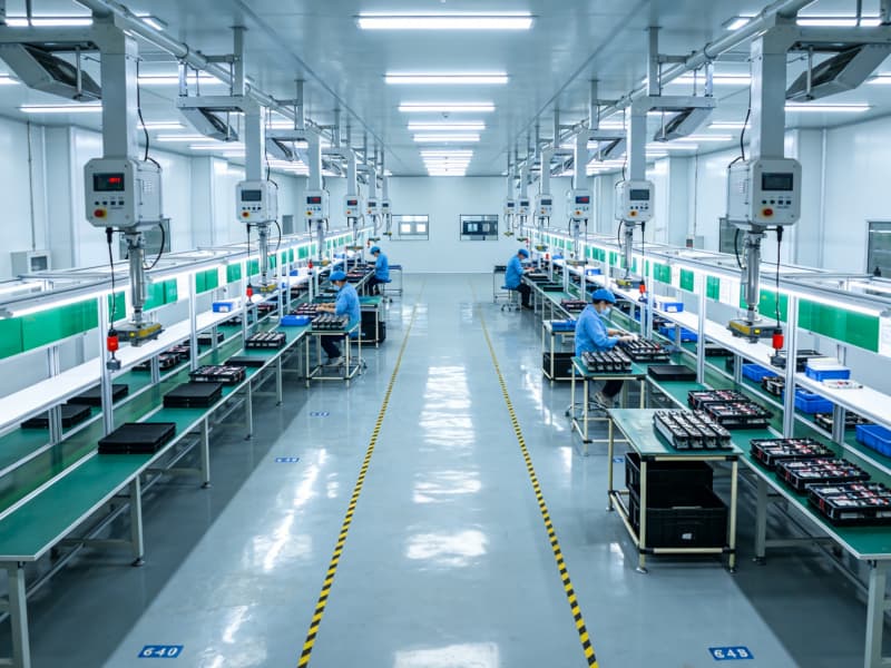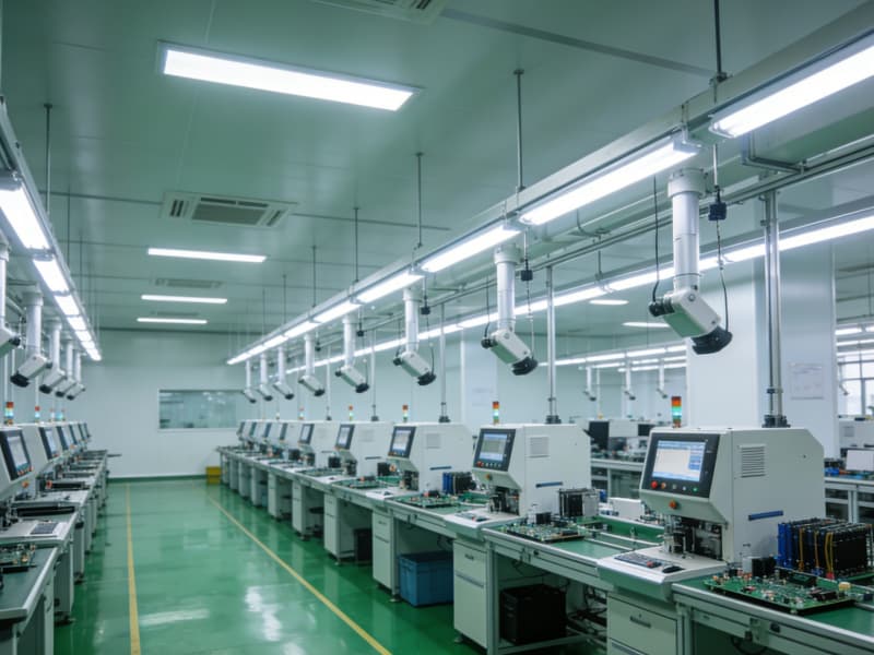 進入內(nèi)部,生產(chǎn)區(qū)布局緊湊且合理,采用智能化的懸掛式生產(chǎn)設(shè)備,搭配可調(diào)節(jié)的無影燈光源,確保生產(chǎn)操作的精準(zhǔn)度。地面使用防靜電地坪,滿足電子設(shè)備生產(chǎn)需求。