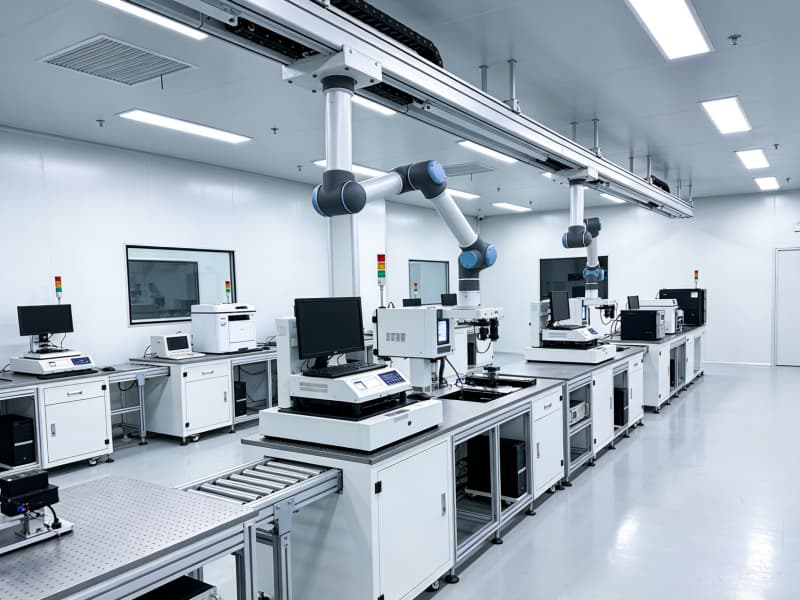 產(chǎn)品測試區(qū)以白色為主色調(diào),營造簡潔純凈的環(huán)境。各類先進的測試儀器有序擺放,頂部的軌道式機械臂可輔助完成復(fù)雜測試流程。