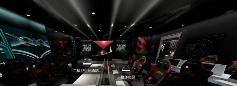 在二樓設(shè)備相對(duì)密集的競(jìng)技區(qū),減少了主題相關(guān)的飾物和設(shè)計(jì),純粹用燈光來(lái)完成整個(gè)空間設(shè)計(jì)感的延伸,恰如其分地處理了密集空間地緊縮感。