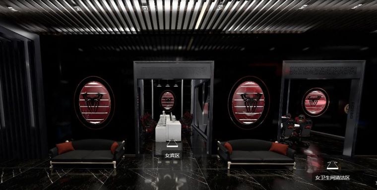 在迎賓區(qū)兩邊,左右分布著男賓區(qū)和女賓區(qū)。相較于普通網(wǎng)咖設(shè)計(jì),電競(jìng)會(huì)館具有賽事承辦上的專(zhuān)業(yè)特色,為了使人更加有比賽所需專(zhuān)注,男賓區(qū)墻面只有簡(jiǎn)單的涂鴉,飾物元素也極少,相較于男賓區(qū)設(shè)計(jì)較為簡(jiǎn)單,女賓區(qū)“紅蜘蛛”主題感十足,頂墻燈光合理搭配來(lái)減少黑色來(lái)的的壓抑感。男女獨(dú)立衛(wèi)生間分別分布在兩個(gè)區(qū)域,非常人性化。